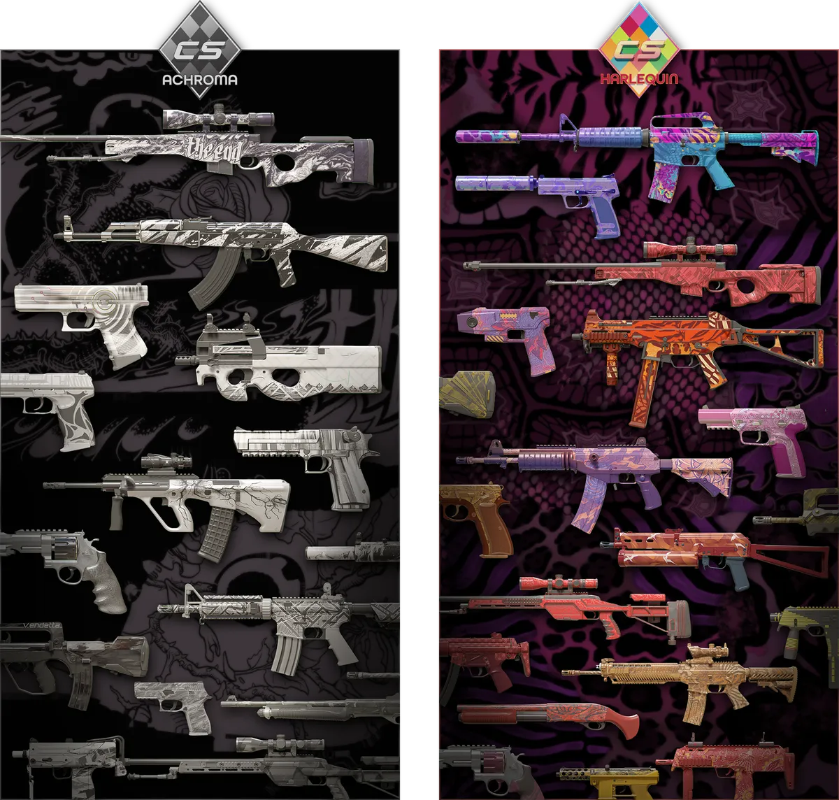 Deux nouvelles collections de skins ont été introduites, Harlequin et Achroma, l’une dans un thème très coloré et l’autre non, vous pouvez donc obtenir de nouveaux skins une fois par semaine lors d’un passage de niveau d’XP. Aussi, l’AK-47 | Aphrodite intègre l’Arsenal pour remplacer la M4A1-S | Solitude dans l’édition limitée.